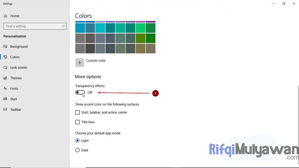 - Selanjutnya ubah dan pilih Make start, taskbar, and action center transparent yang awalnya turn on menjadi turn off
