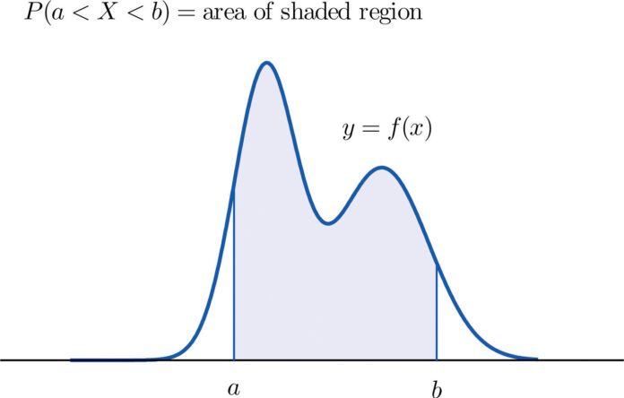 Di mana f(x) adalah fungsi kepadatan probabilitas variabel acak kontinu X, dan a dan b adalah batas bawah dan atas dari rentang nilai yang diinginkan.
