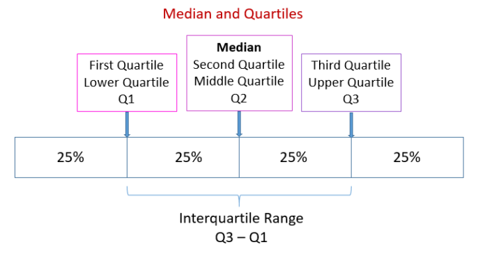 Sedangkan menurut Bowerman dan O’Connell (2018), quartile adalah nilai yang membagi data menjadi empat bagian yang sama besar. Quartile pertama (Q1) adalah nilai tengah dari data yang terletak di bawah median. Quartile kedua (Q2) adalah median dari data. Quartile ketiga (Q3) adalah nilai tengah dari data yang terletak di atas median. Quartile keempat (Q4) adalah nilai maksimum dari data.